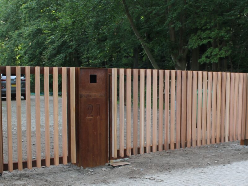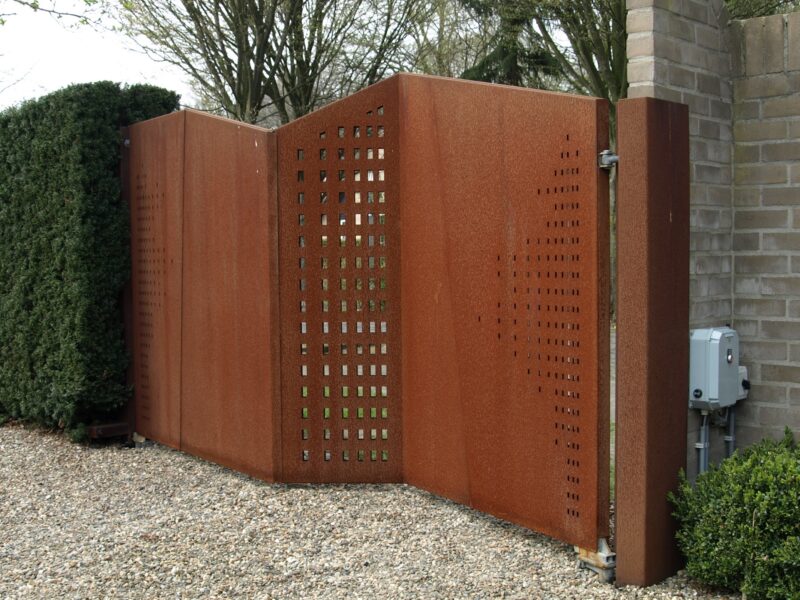 Cortenstaal is een speciale staalsoort die een natuurlijke roestlaag vormt. Deze laag beschermt het materiaal tegen verdere corrosie, waardoor het extreem duurzaam is. Het resultaat: een poort met een unieke, warme uitstraling die met de jaren mooier wordt.